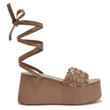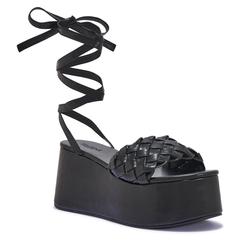 - Chunky Platform Wedge Heel Woven Strap Sandal- Tie-up ankle ribbon detail- Available in staple colours- Faux PU Woven Strap Upper